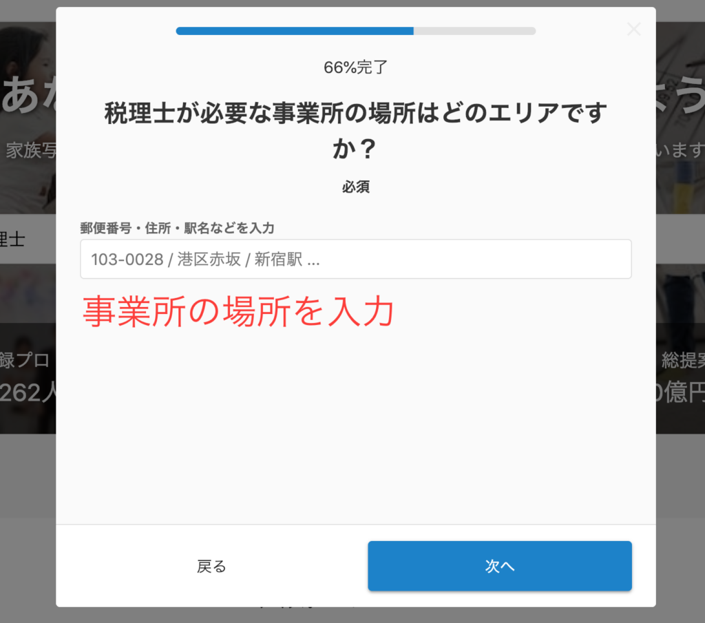 事業所の場所を細く入力しておくとお近くのプロの方とマッチングされる可能性が上がります。