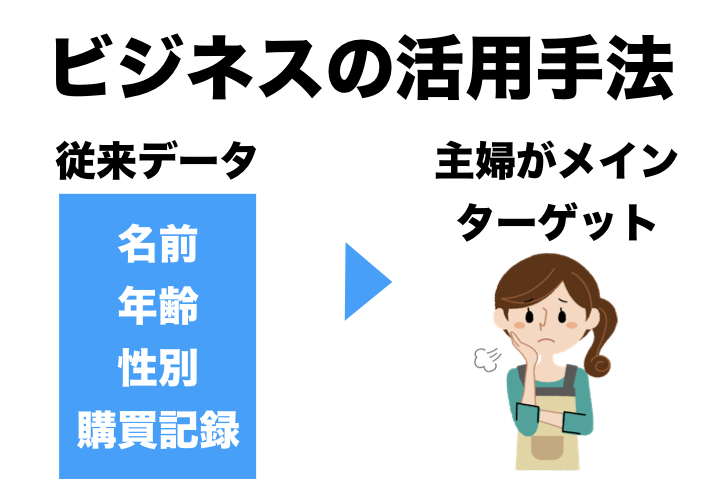 今回の例えだと従来のターゲットでは主婦オンリーだったわけですが、ビッグデータを活用したことにより、実は夫婦もターゲットとして新たに加わるわけです。