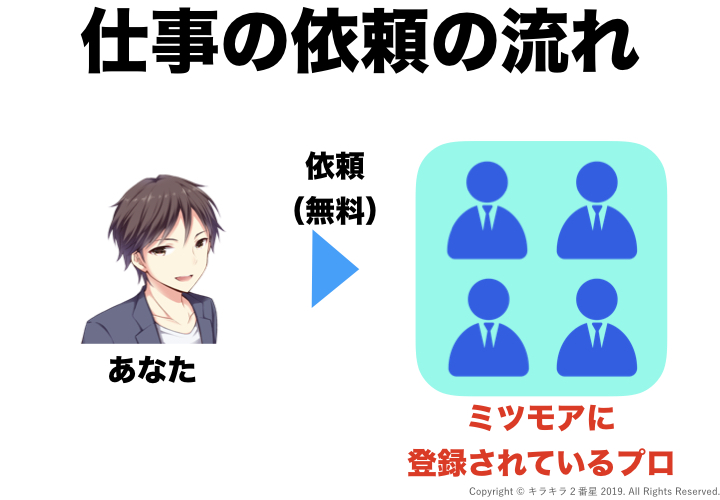 仕事を依頼する側はミツモアのシステムを無料で利用しプロに見積依頼ができます。