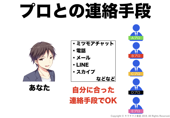 ミツモアに登録されているプロとの連絡手段は基本的に自由です。